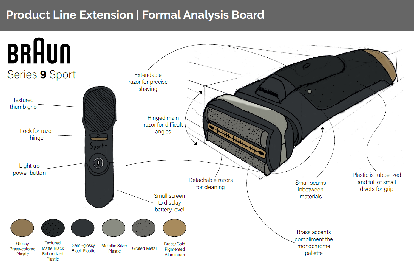 I analyzed the design attributes of the Braun Series Sport+ razor by closely studying its form, materials, and overall user experience. I examined how the handle geometry, color accents, and surface finishes work together to create a product that feels both intentional and refined.